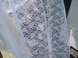 I found two lace panels at a thrift store and paid, perhaps, a dollar for both of them. Each have ragged edges, perhaps someone had purchased them for another project and, eventually, decided to just toss them in the Goodwill box. Their loss, my gain -smile-.