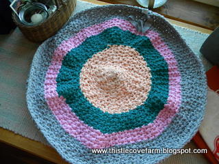 The second attempt was a, trifle, more successful than the first. At least, the strips were cut into one-half inch strips and much, much easier to crochet. The pad started with five chain stitches, joined to make a circle and then I started with double crochet stitches which made a huge difference in both ease of crochet and in the way the pad lays flat with no “crown” in the center. Unfortunately, you can see I haven’t quite learned about weaving in my ends and the back is a hodgepodge of raw ends sticking up.