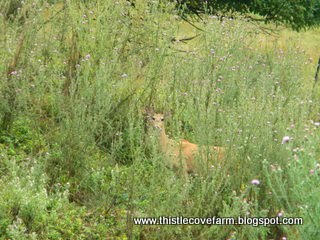 At first glimpse, this is what I saw and believe the deer was, slowing, going towards the stand of apple trees. The thistles in this field are so tall, it’s difficult to see the deer but God gave me an eye to see what’s not supposed to be there…or so Dave tells me. I thought everyone could see what’s not supposed to be there but no. Dave tells me I have the ability to see the king is wearing no clothes and laughing at us in the bargain. Sigh. Those with eyes to see and ears to hear…
