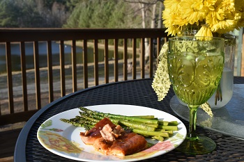 This week, hallelujah! it’s been warm enough to have my first meal on the deck overlooking the pond lake pond lake…whichever it is. You decide. Grilled salmon with honey sauce and roasted asparagus with EVOO, S&P and the gifted flowers which brighten up the table immensely.