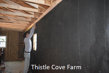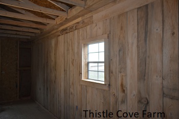 But the BEST, by far, was the studio…it’s closer to being finished! Joe (Cabins and More in Tazewell, VA) did the inside work using R-13 insulation covered with roofing paper which was covered with my rough cut hemlock. He said I should be able to heat it with a candle this winter (grin).