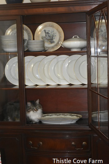 The dining room furniture was delivered…WOOHOO…and it looks fabulous! More photos later but wanted you to know even Gypsy approves as she found her spot on the lower shelf before the rest of the china was added. At least, the rest of it that’s unpacked; there are still a few dozen boxes of “stuff” in the basement and I’m hoping to find kitchen knives, rest of dishes and Lord only knows what else. John Robertson, owner East Coast Primitives, did a fabulous job and it’s nice to have available dishes, tea sets and other things that hold so many memories. (When he first arrived, John exclaimed, “You sure do like your solitude, don’t you?!” My response, “Yes, I like people in small numbers and from a great distance.” which is not surprising considering I am INTJ. (Dave was also INTJ and was in process of applying to MENSA, while I’m hard pressed to pass algebra. LOL)