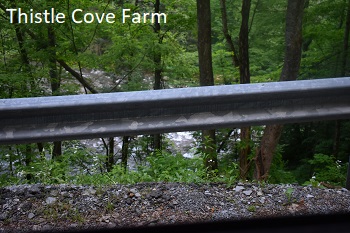 Part of the drive goes through Goshen Pass, a wild, natural preserve in Virginia’s Allegheny/Appalachian Mountains. It’s beautiful but if one isn’t used to the drive (which is mild compared to what’s to come!), it can be more than a trifle daunting. In the above photo, the white line is inches, not feet, away from the shoulder which is soft from spring rains. Those pitiful lil’ upright yellow sticks are there to say stay away and not to prevent a tumble into the turbulent Maury River rushing by.